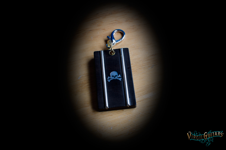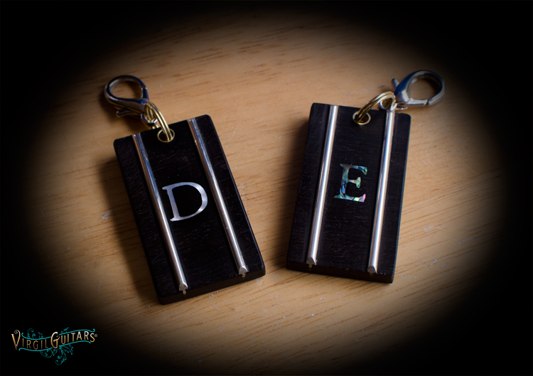 These are totally awesome! Have Virgil inlay your favorite initial (1 initial only!) in either white mother-of-pearl or abalone into an ebony fingerboard - it has a 12" radius, nickel frets, brass tube insert, key ring and lobster claw for quick fastening to your current keychain. These are the ORIGINAL and ONLY Fretboard Keychains in the world! Specify which letter and either white mother-of-pearl or abalone - 1 letter only and will ship within a week of you ordering: