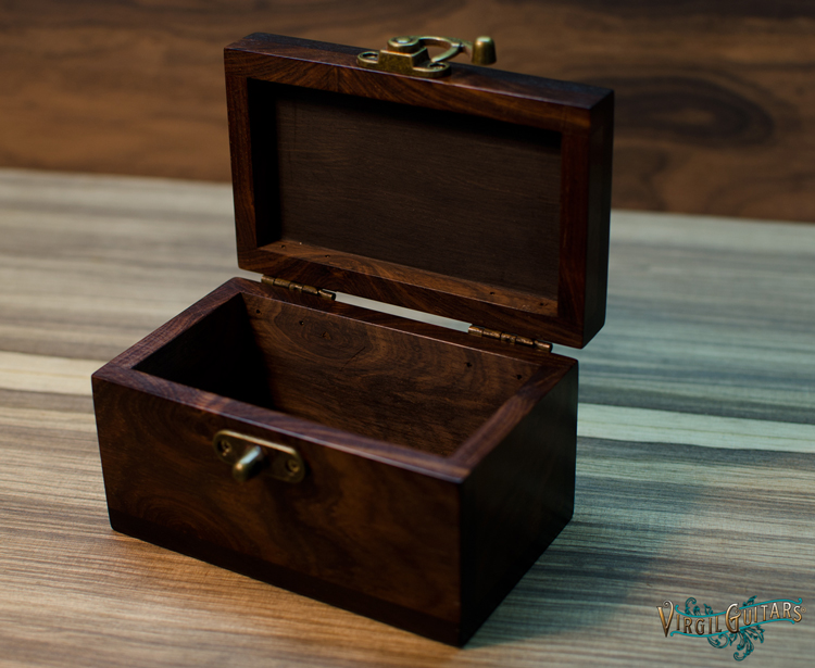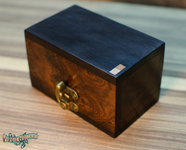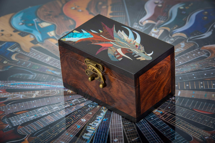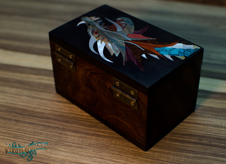 This amazing box is made from Amazonian Rosewood and Gabon Ebony. There are numerous materials used for the inlay, including deer antlet (the nose horn), Sterling silver (tongue and whiskers) and prehistoric shark's teeth (the teeth). A solid piece of craftsmanship, the representation of Virgil's ver first, worl-renowned guitar, the "Dueling Dragons". this even includes the DNA (wood runoff) from the original guitar inlaid into the bottom of this amazing box. It sports a natural wax finish and will be treasured for a lifetime and passed down for generations. Dimensions: 4.57" wide x 2.79" front to back x 2.73" high. buy here: