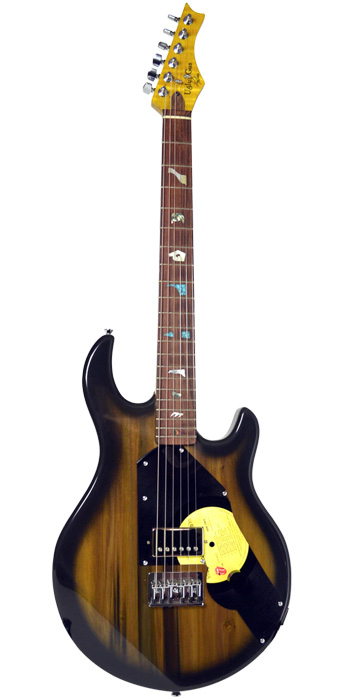 The Ugly Gus series is our first model with a bolt-on neck. They are a 25.5" scale guitar and use "Upcycling", which is finding another use for something that would normally be thrown in the garbage. Since the beginning of Virgil Guitars, I have been saving scrap pieces of shell, recon stone and other assorted materials that are leftovers from other builds. One day, I came up with the idea to inlay these "scrap pieces" into a fingerboard. What's cool is, the pieces require no sawing and it looks like pop art! There would NEVER be the possibilty of 2 guitars looking alike and we have some serious DNA running through these guitars, which gives them some extra mojo as well! We also use different materials for the pickguard and in this case we used the classic Rolling Stones album 'Some Girls'. This guitar was presented to Virgil's oldest brother Glenn on June 11th, 2014 as a gift.